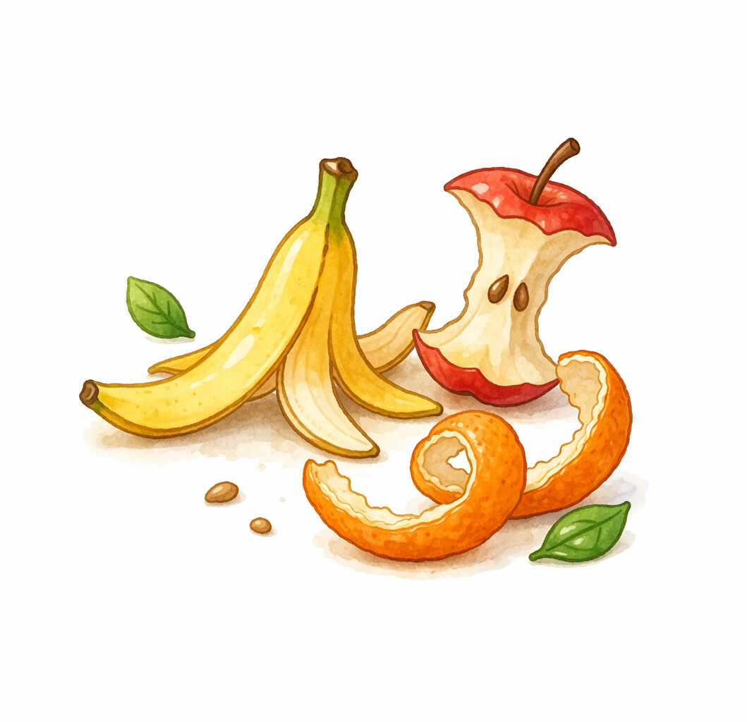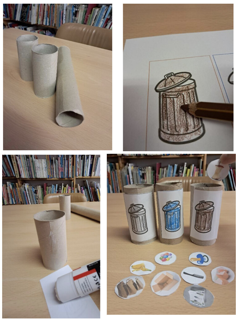 Prepare three cardboard tubes (for example, from paper towel rolls) and cut them to a length of 10 cm. Print the material on thicker paper. You can also laminate the picture tokens so they will last longer. Let the children colour the bins in the colours used in your country for sorting organic waste, paper and cardboard, and general waste. Cut out the coloured bins and glue them onto the tubes.