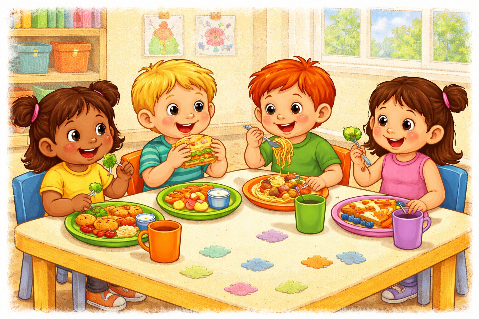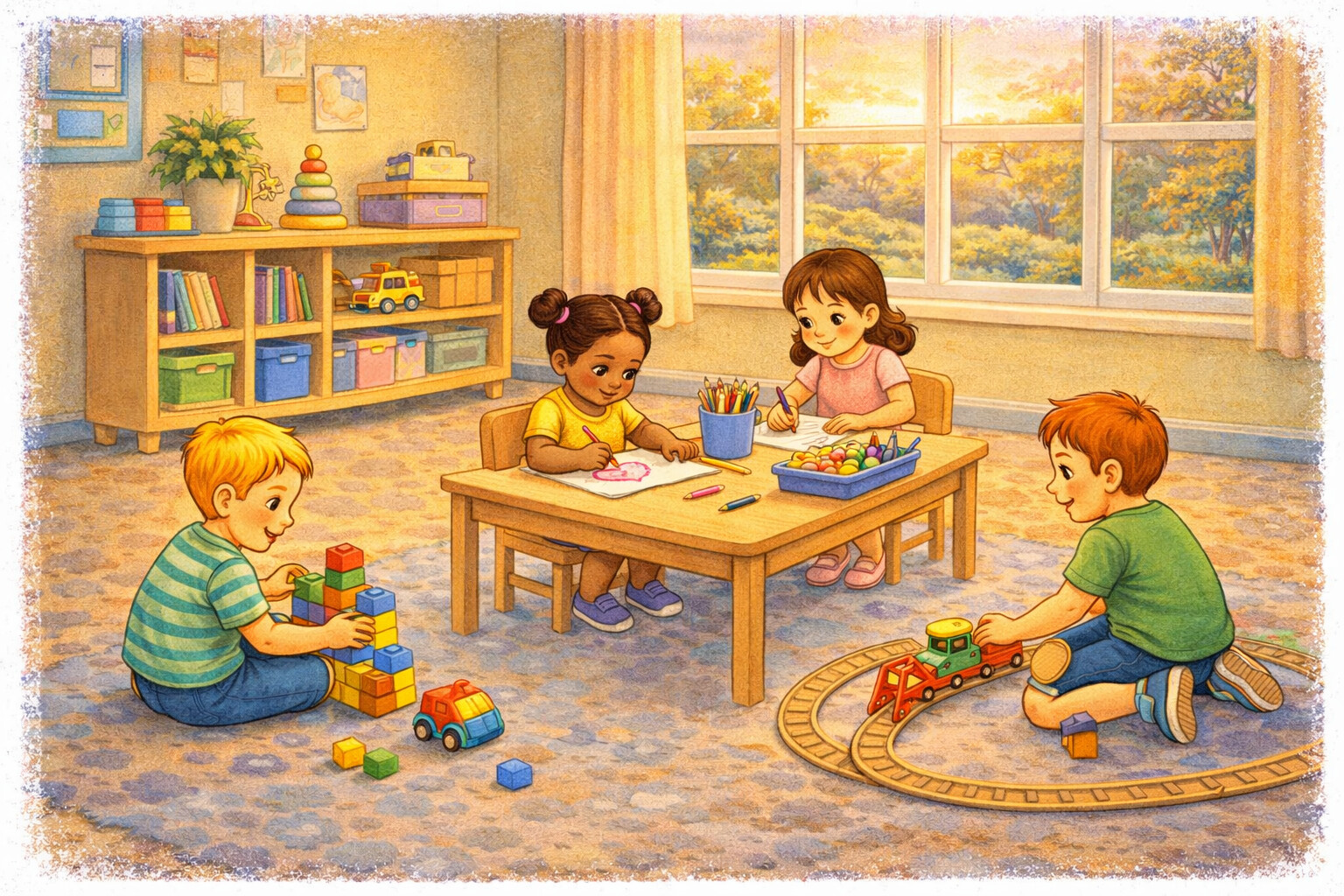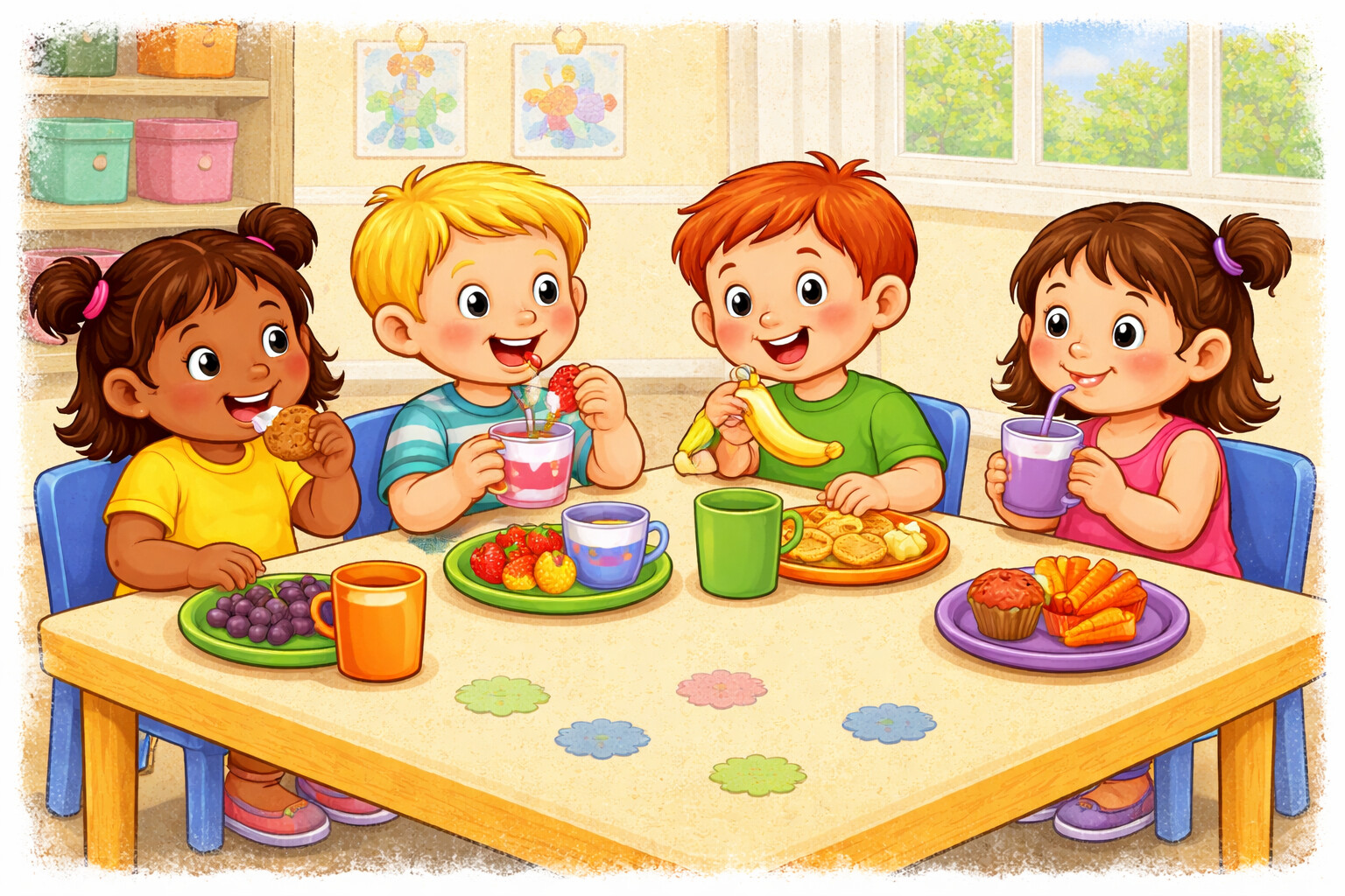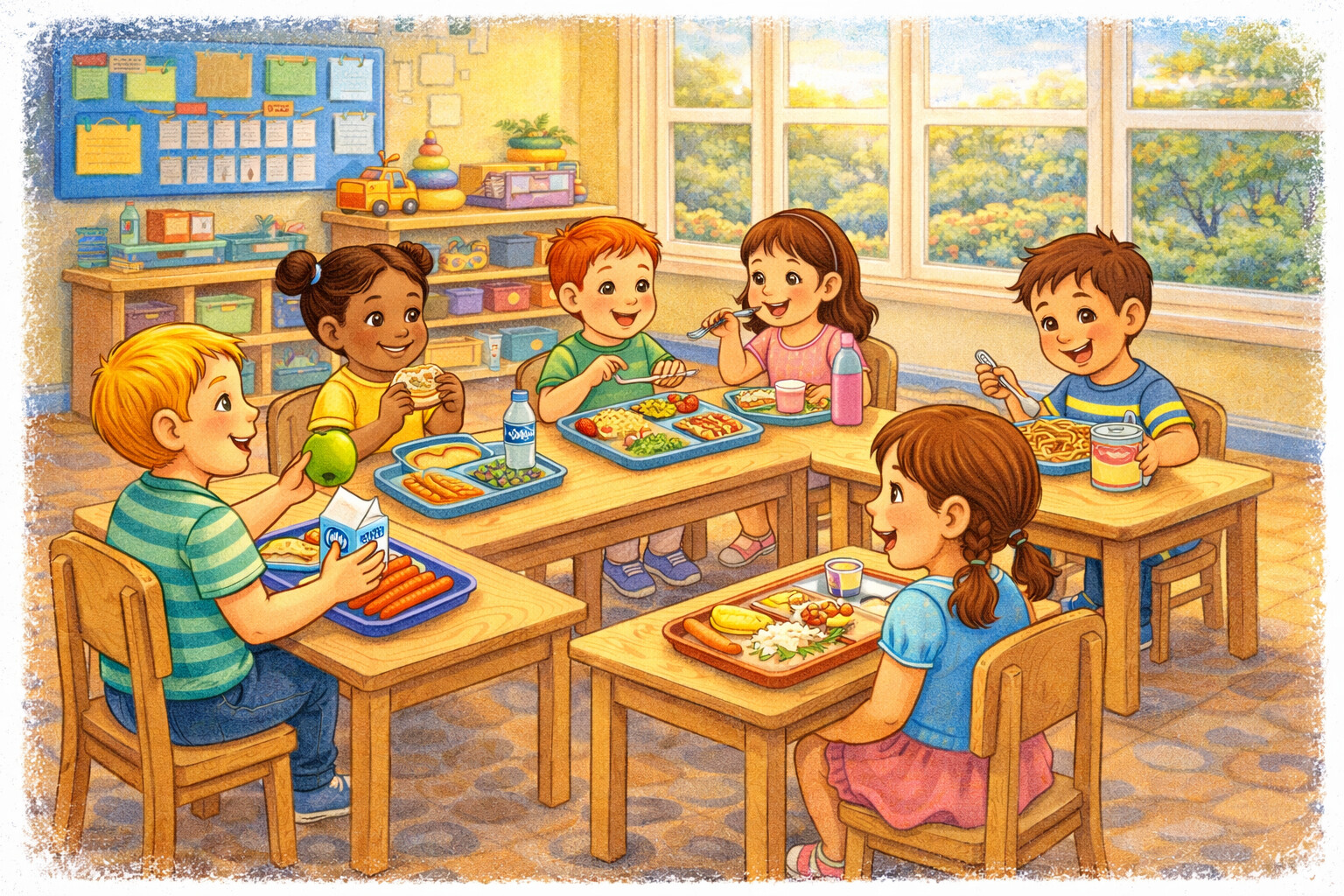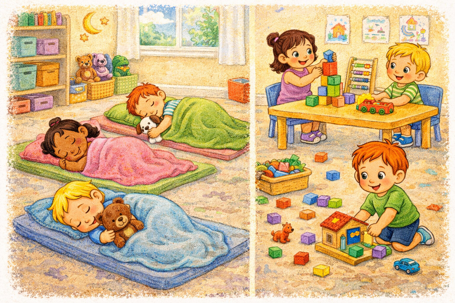 Children and the teacher collaborate to plan the next day’s routine, deciding how to meet needs like rest, food, and playtime together.