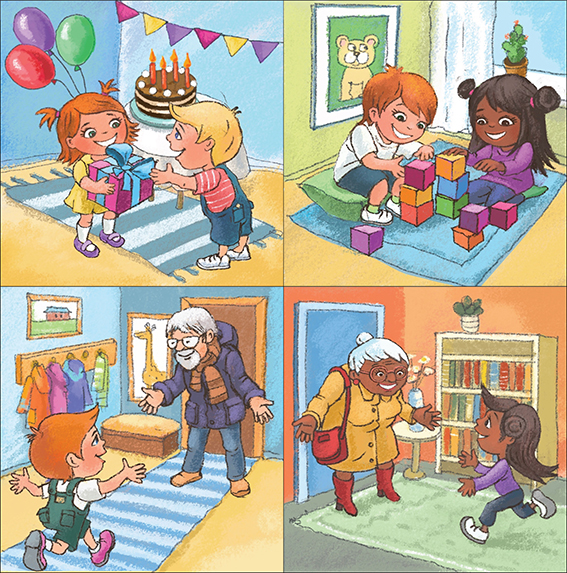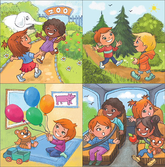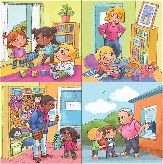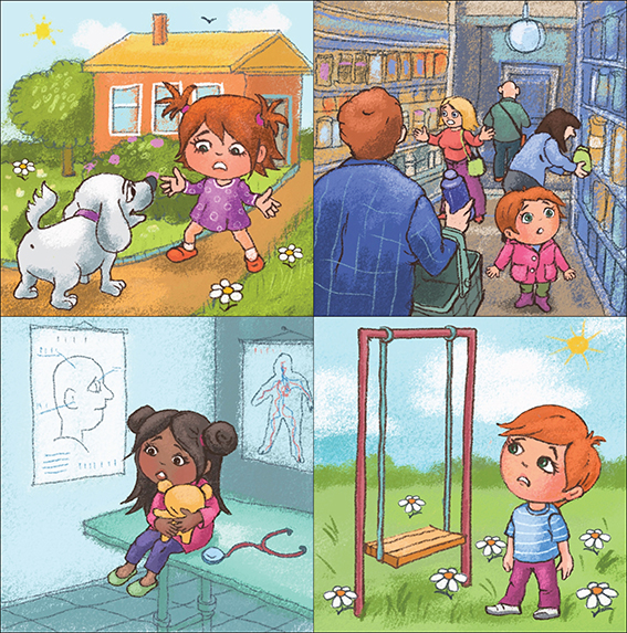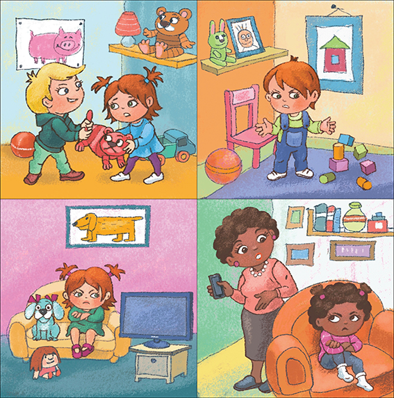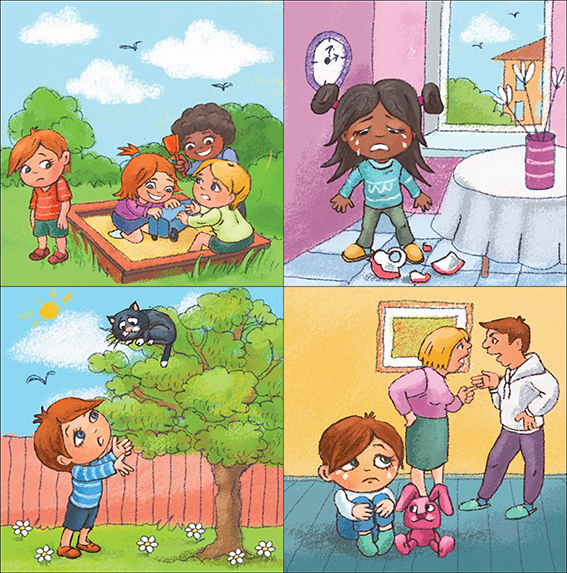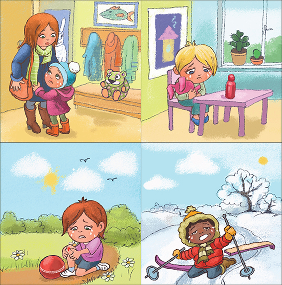 Let the children talk about what happens in each picture and use their puppets to show how the child in the story might feel at every step.