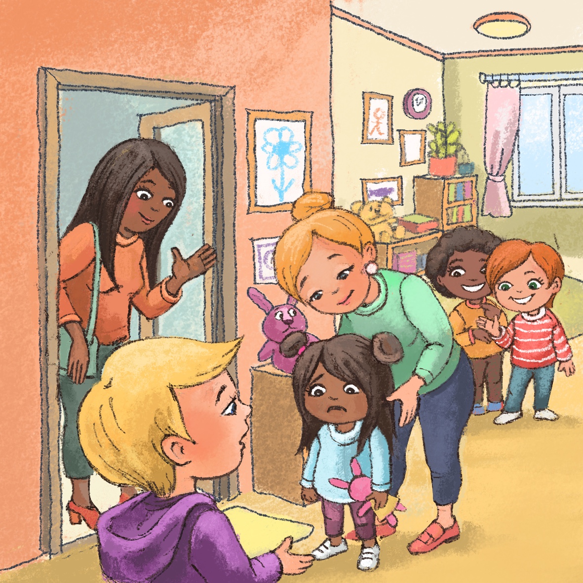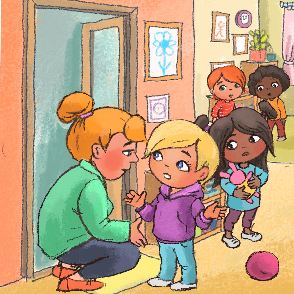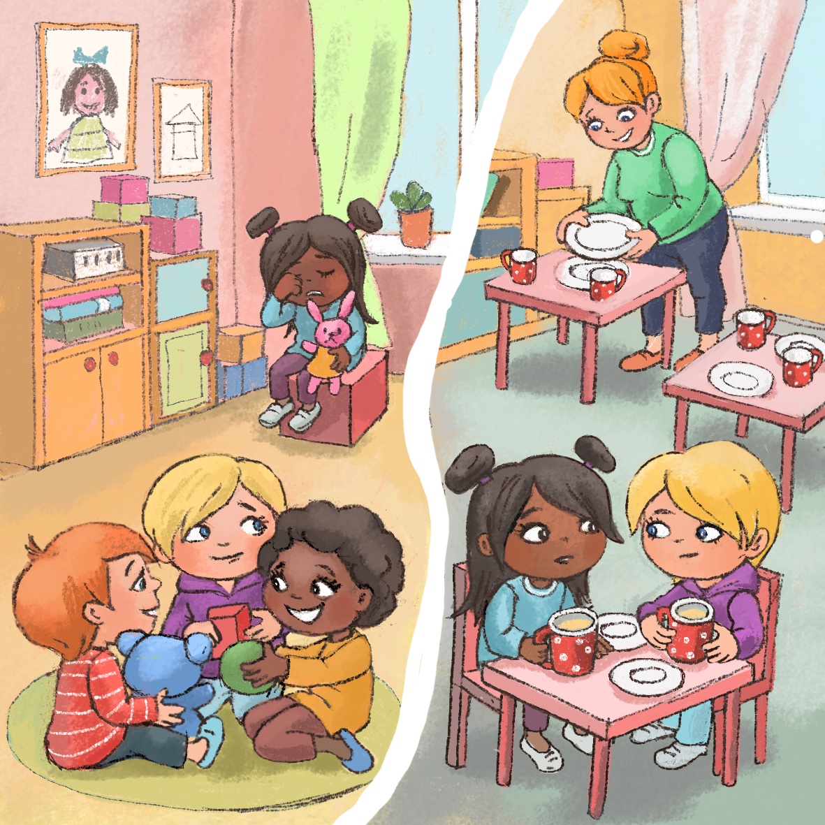 Kira and Miro go to kindergarten at Rose Hill. They are in a group of five-year-olds. They make many friends and always feel comfortable with their teachers. This morning, Kira finds it hard to say goodbye to her mother. Streams of tears run down her cheeks when she finally manages to step into the group room. Her mother waves at her worriedly, and her teacher tries to encourage her. Miro does not understand why Kira is sad. From the corner where the children play, he hears the other children making fun of Kira's distress and calling her a baby. He does not like that at all. Miro finds himself in an inconvenient situation as he sees his friend Kira upset.