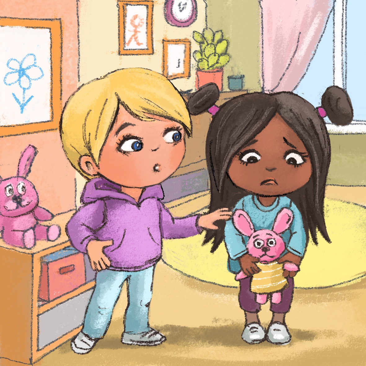 Miro complains to Kira about Tim. He tells Kira that Tim is mean. He says, “Kira, if you are a true friend you have to help me!” Kira likes Miro. She gets mad about Tim. She approaches Tim and without a word she tries to take the crayon from his hand. Tim pulls back. Kira holds on. In the struggle the crayon breaks.