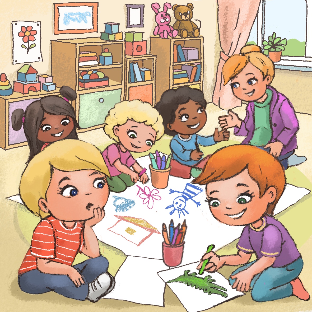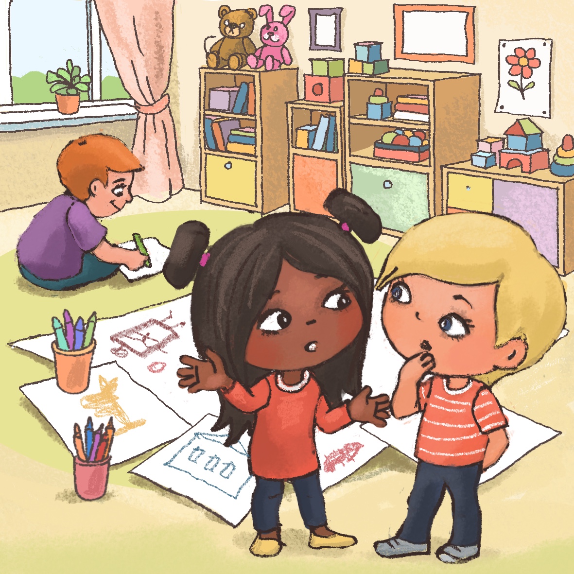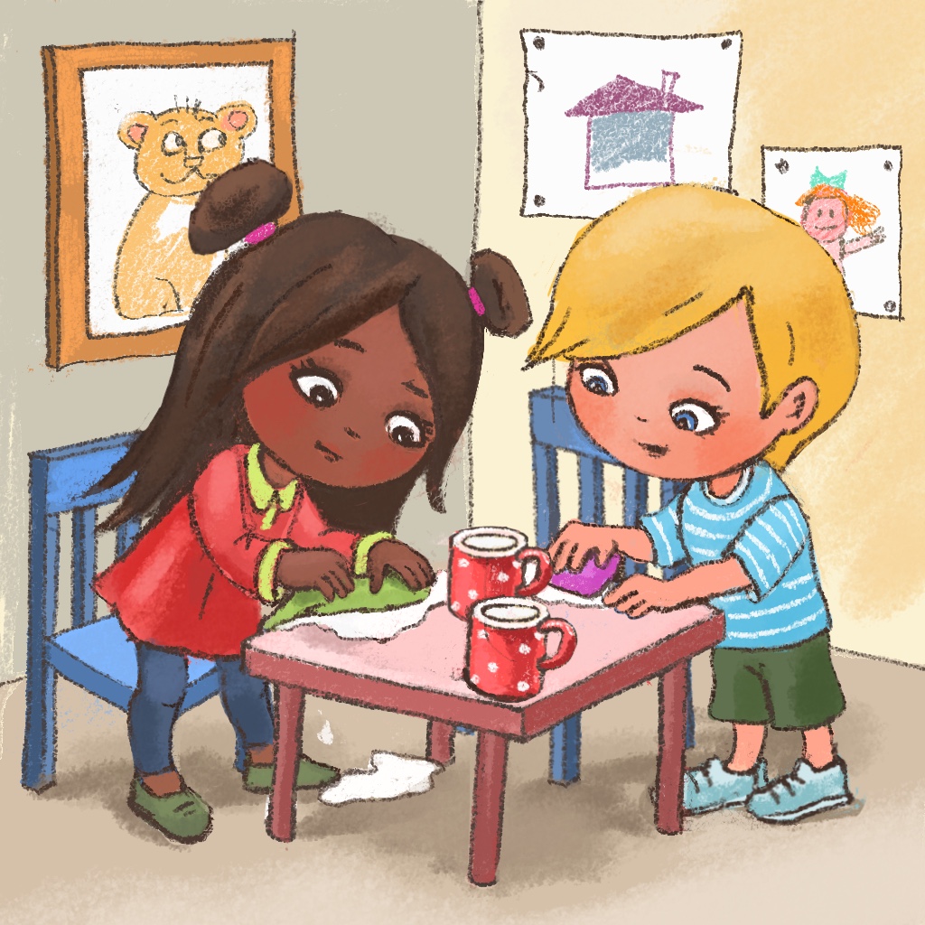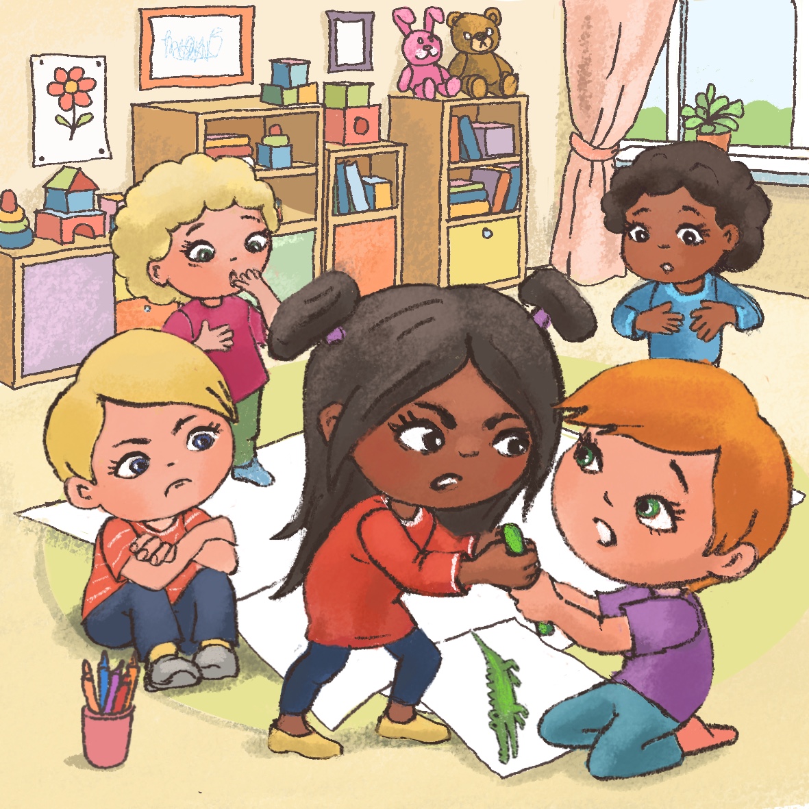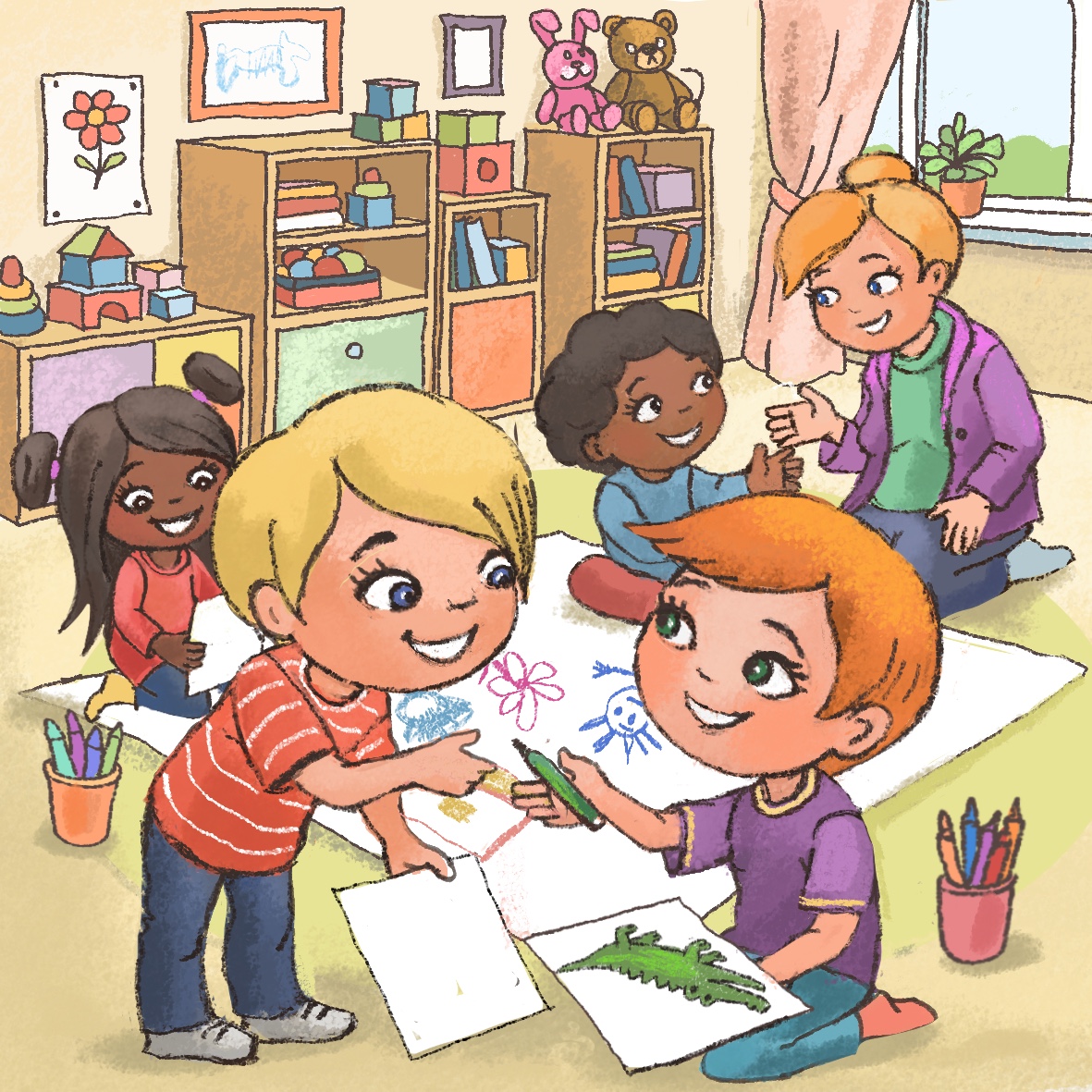 After breakfast, the teacher invites all children into a circle. “Children, yesterday we talked about creating a group picture. You wanted to draw your favorite toys on it. Look here on this big poster we have on the floor, each of you can start drawing.” The teacher shares the pots with the crayons among the children. The children start drawing. Miro decides to draw a green dragon, but he cannot find a special green crayon he usually uses for drawing reptiles. He looks around and notices Tim, who is drawing a crocodile with this special green crayon. Miro wonders what he should do to get the crayon?