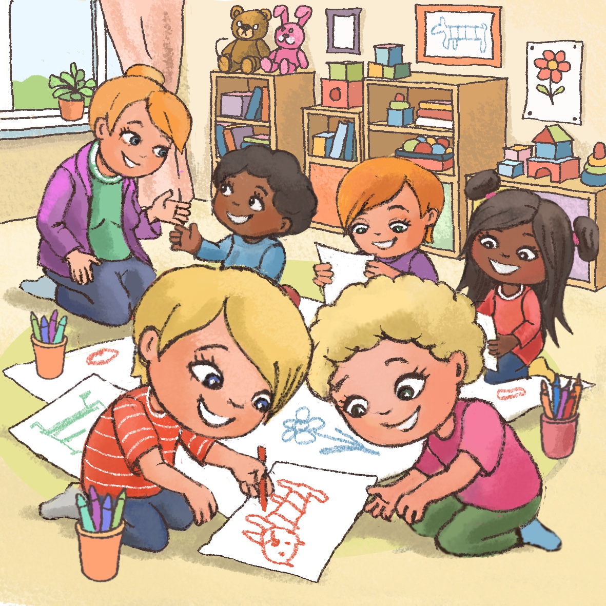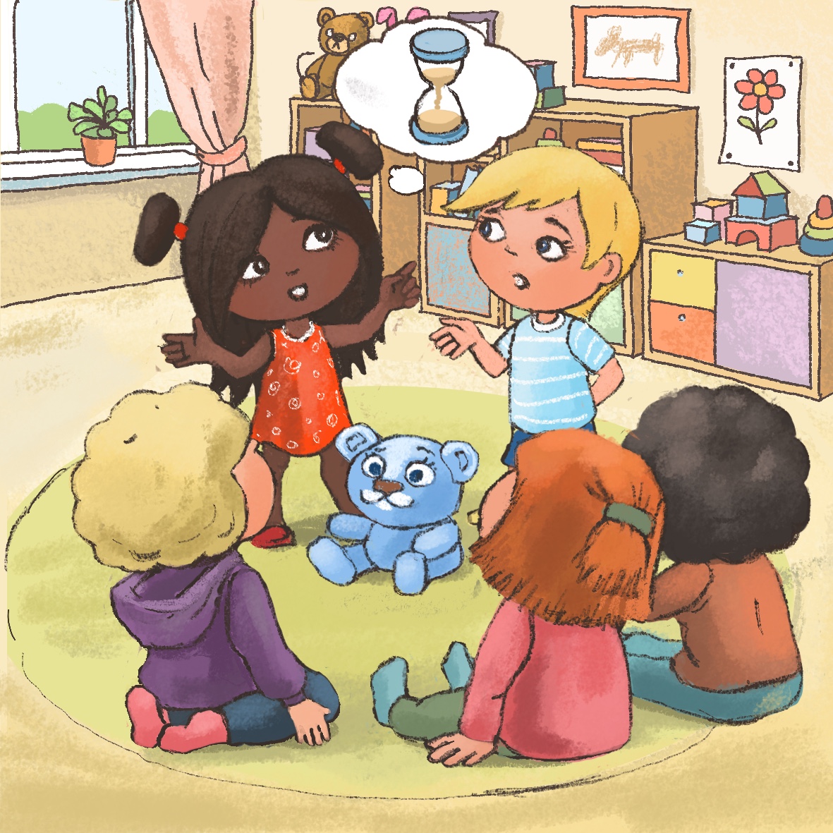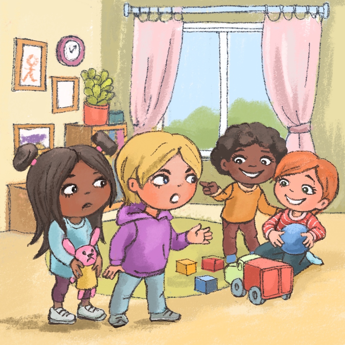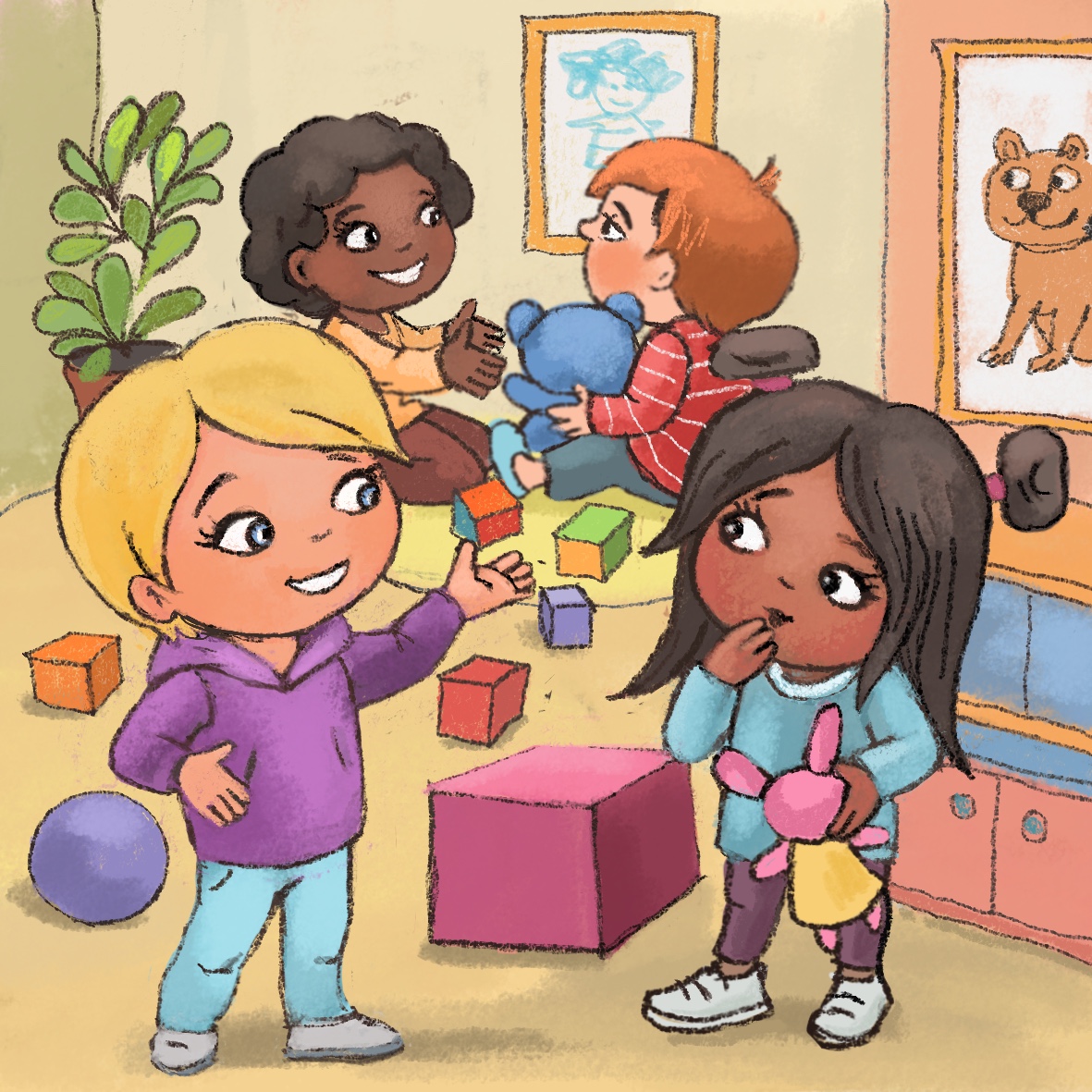 After breakfast, the teacher invites all children into a circle. “Children, yesterday we talked about creating a group picture. You wanted to draw your favorite toys on it. Look here on this big poster we have on the floor, each of you can start drawing.” The teacher shares the pots with the crayons among the children. The children start drawing. Miro decides to draw a green dragon, but he cannot find a special green crayon he usually uses for drawing reptiles. He looks around and notices Tim, who is drawing a crocodile with this special green crayon. Miro wonders what he should do to get the crayon?