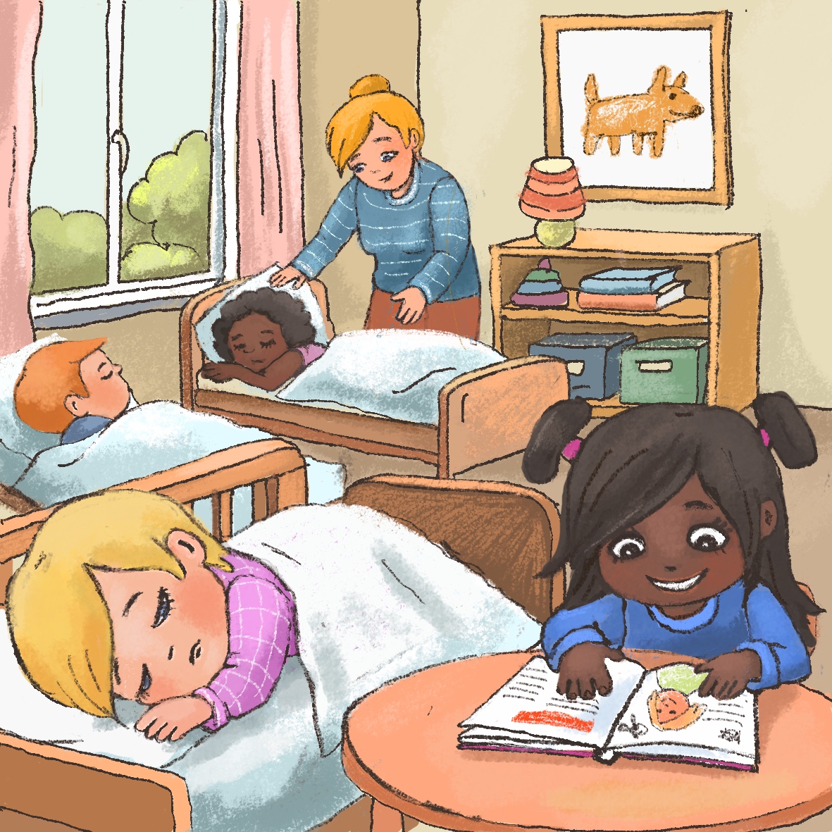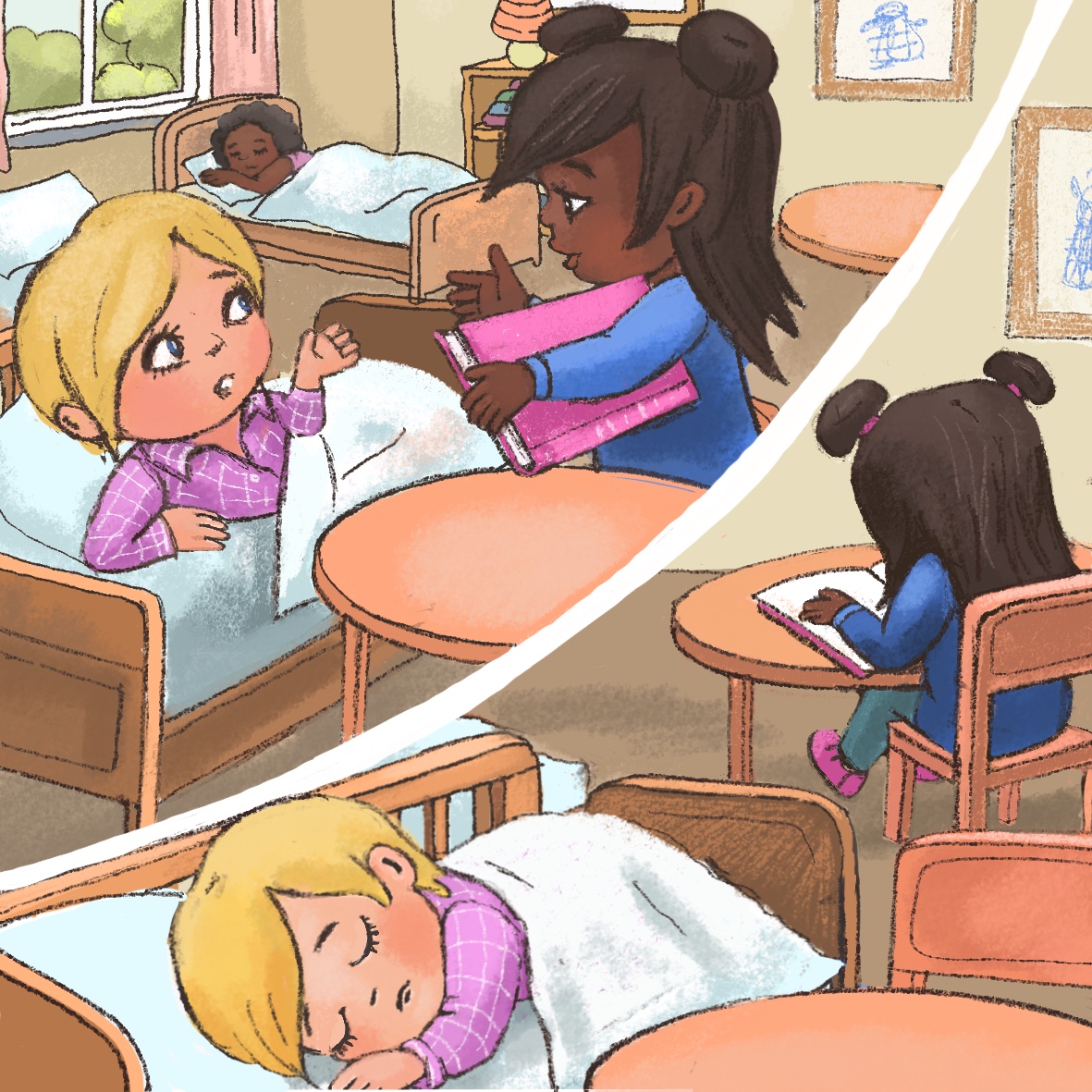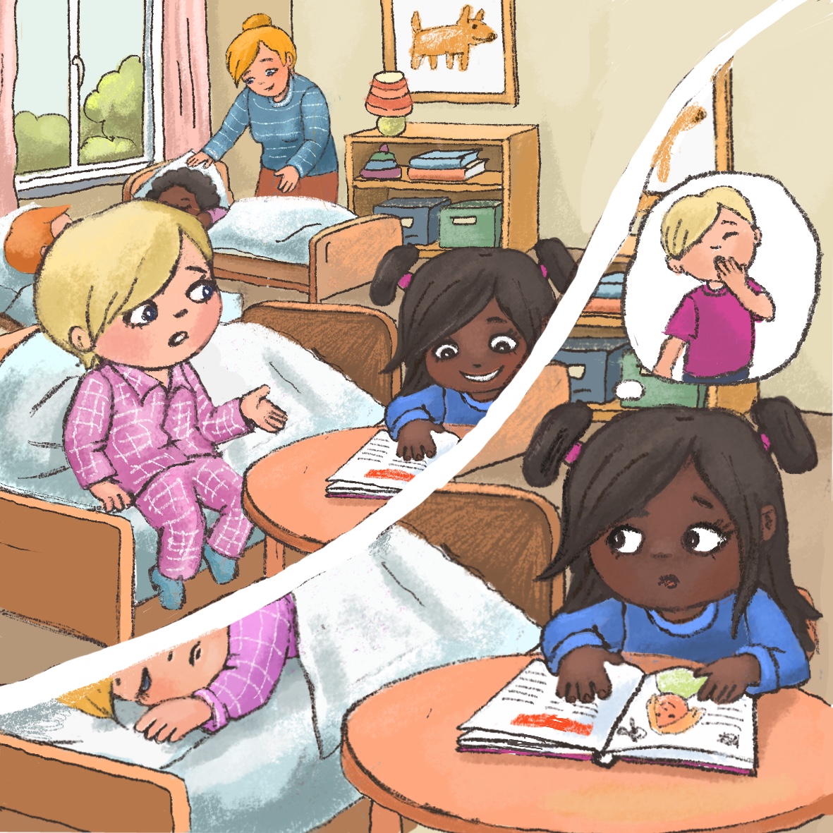 Miro chooses a soft pillow by the window because he is very tired and wants to get some sleep. Kira is not sleepy. She wants to look at books. She sits down at the table near Miro's pillow and starts looking through her favorite picture book, but she is a bit noisy. The pages of the picture book rustle, Kira is murmuring aloud describing what she sees on the pages. Miro feels disturbed and annoyed.