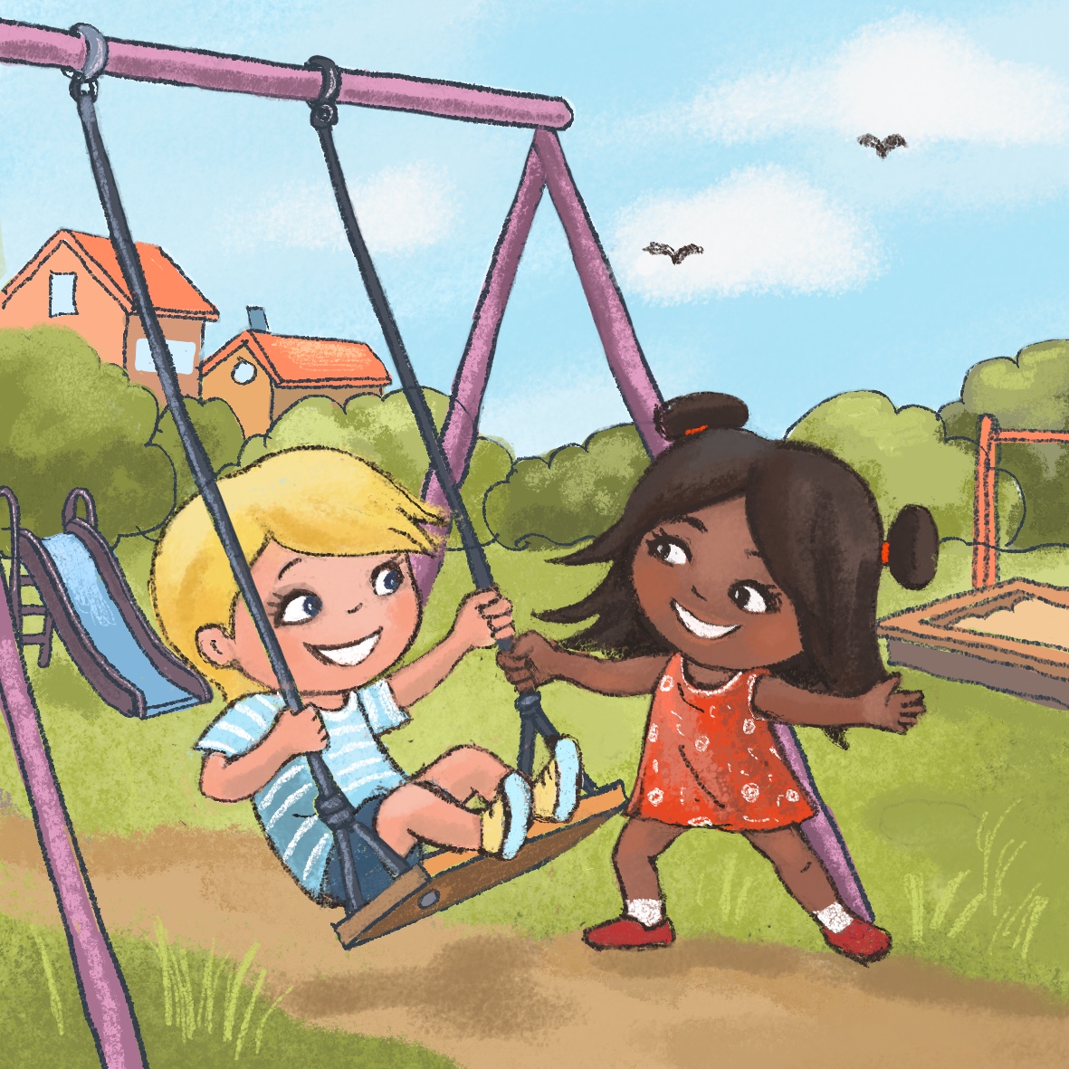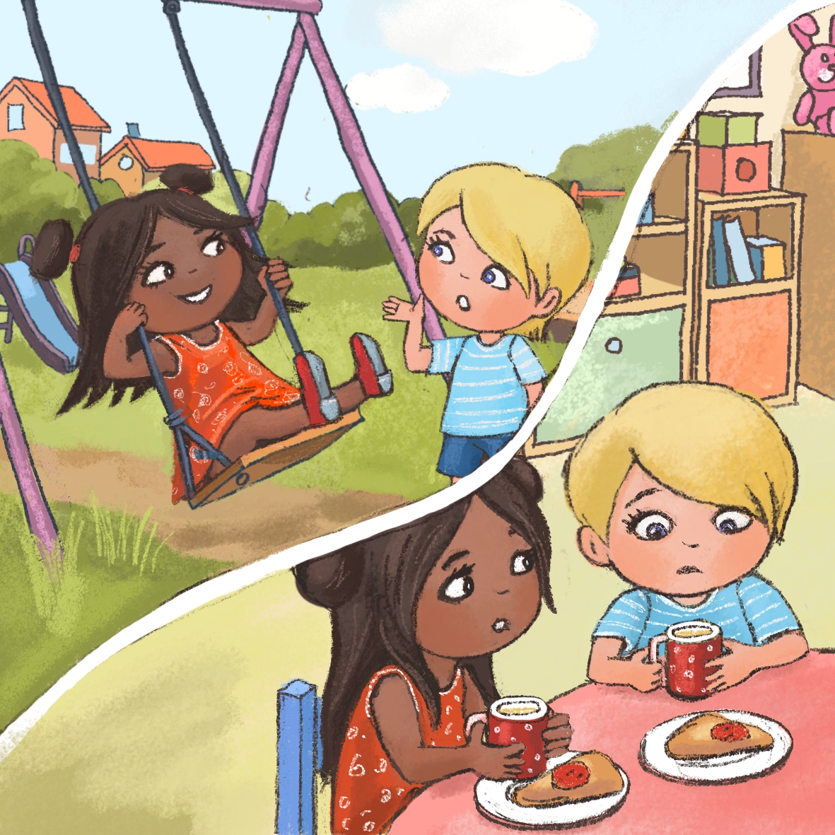 Kira looks at Miro and says, “Just a little more.” Kira continues to swing but shows no sign of stopping. Miro remarks in frustration, “Kira, I've really been waiting a long time!” When Kira finally gets off the swing, Miro takes Kira’s place. But he is no longer looking forward to having fun, knowing that the teacher will soon call them in for lunch. Kira notices that Miro is not at all happy. During lunch, Kira apologizes to Miro: “I'm sorry I was on the swing too long.” Miro nods but still looks frustrated. Kira is not relieved.