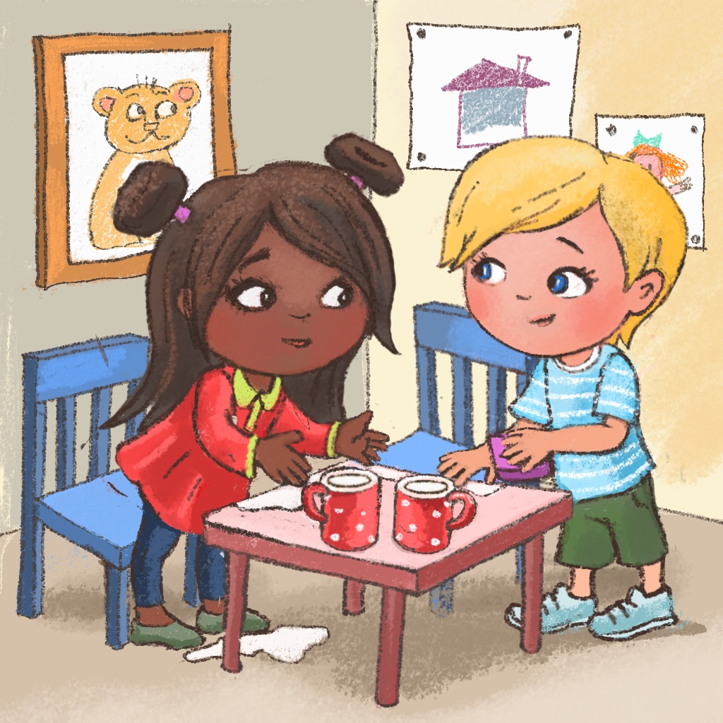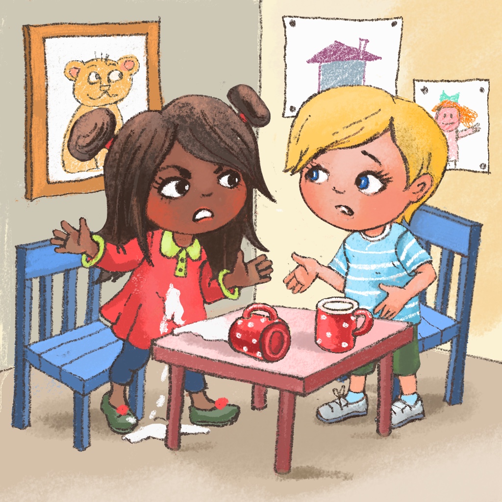 Kira might say, “Oh my, Miro, the table is covered with milk! And I feel sad about my wet dress. I see you did not do it on purpose. What is the best thing to do now?” Miro realizes that he caused two problems, a dirty table and a wet dress. He feels responsible but a little bit overwhelmed. He asks Kira to help him clean the table and promises to help her to change her dress and clean it afterwards.