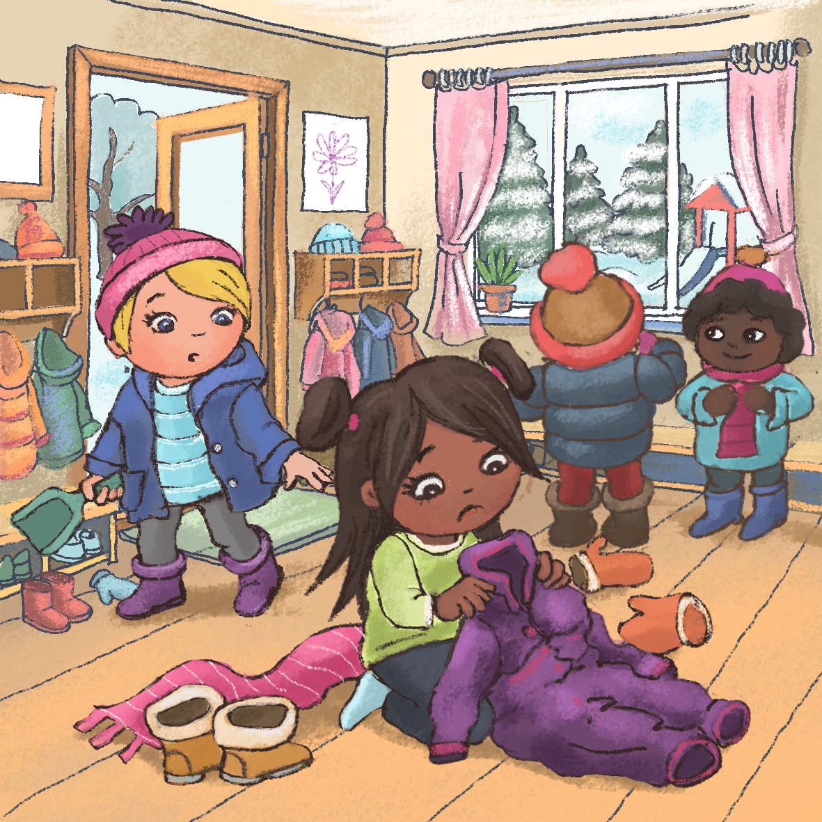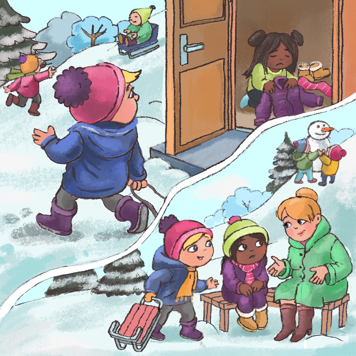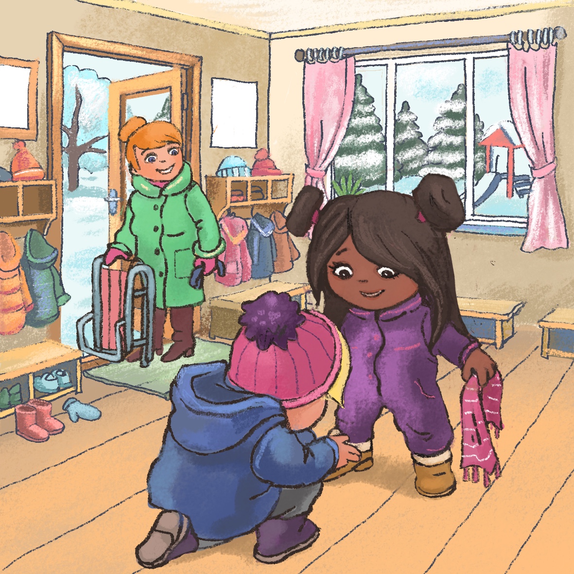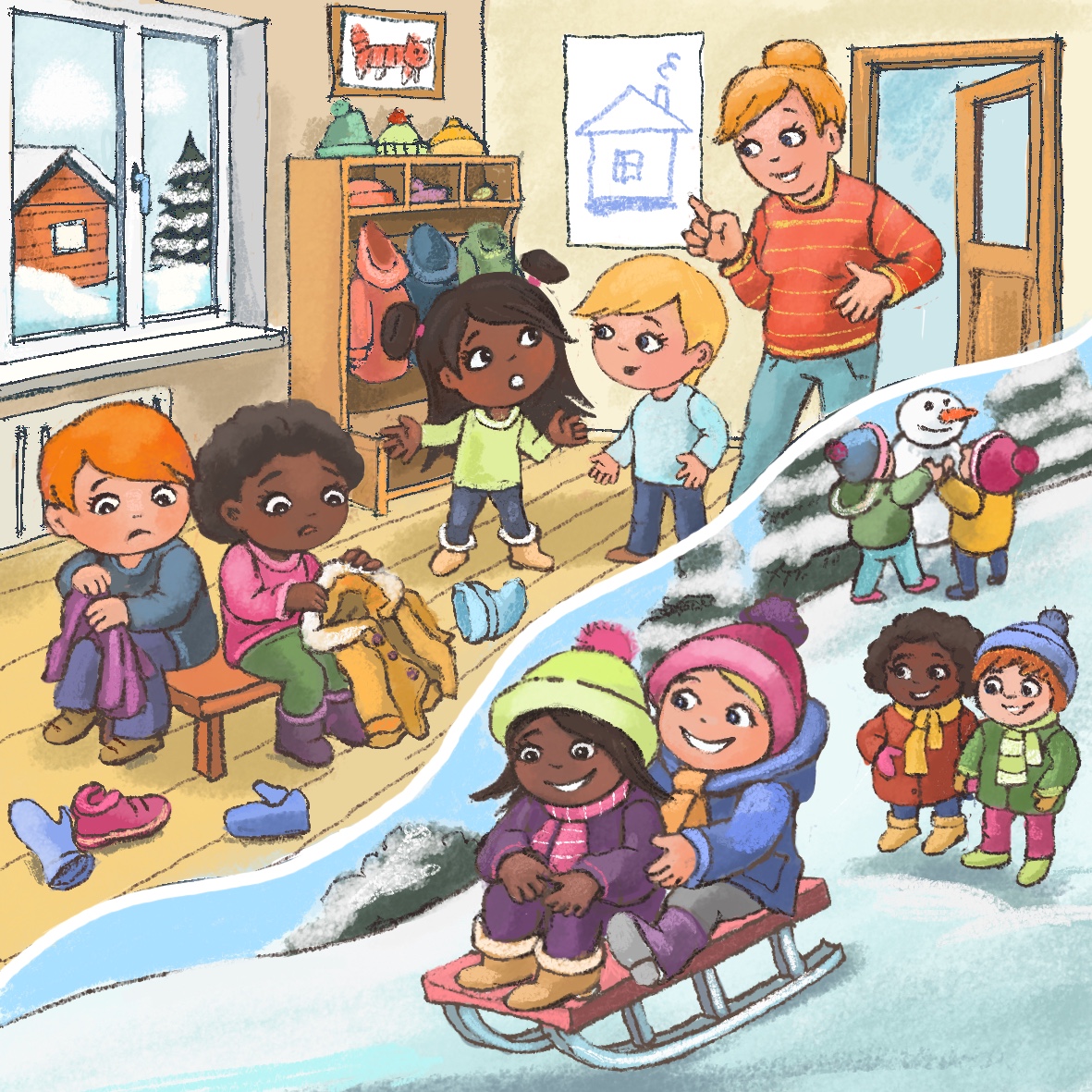 The children at the kindergarten under the Rose Hill finally have the snow they look forward to. After breakfast, the teacher calls them: “Children, today you will be able to play in the snow and we have some sledges for you to slide down the hill. Get dressed quickly so you can enjoy the snow as soon as possible.” The children run to the wardrobe and start putting on their winter clothes. Miro is one of the first to get ready. He stands by the door and watches everyone rushing around. In the corner, he sees Kira looking helplessly at her bundle of new winter clothes. She does not know how to get into her brand-new outdoor outfit nor which clothes to start with. Miro feels torn: should he put on his gloves and rush to the playground, or should he help Kira?